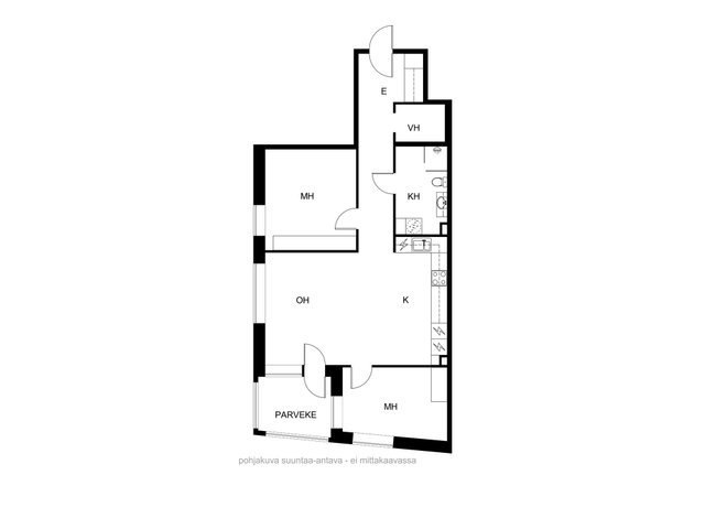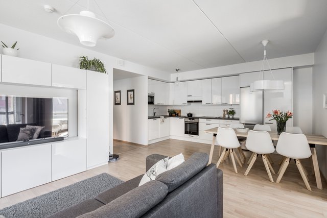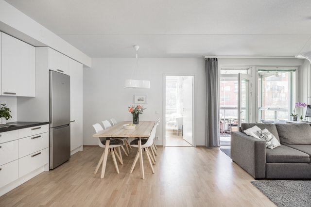Tässä on laadukas ja tilava kolmio edullisella hinnalla ja alueen pienimmällä hoitovastikkeella. Asunnon erityispiirteitä ovat muhkean iso ja avara olohuone sekä avokeittiö, jossa on runsaasti työskentelytasoa ja tilaa suurelle ruokailuryhmälle. Oleskelutila on kokonaan hyvin hyödynnettävissä, koska keittiöön ei ole asennettu kiinteää saareketta. Olohuoneen jatkeena on lasitettu parveke.