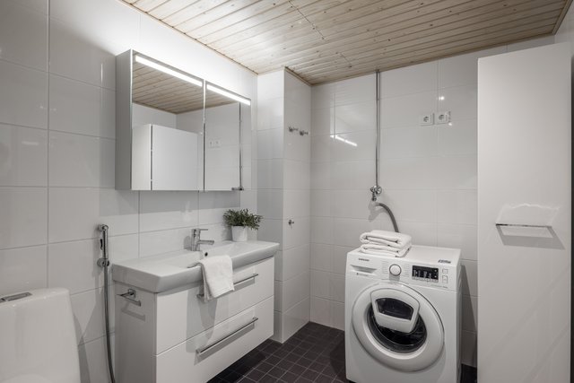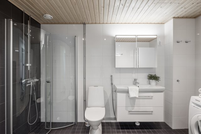 - Suihku, kääntyvät suihkuseinät, peilikaappi, pesuallas, allaskaappi, pesukoneliitäntä, lattialämmitys, kiinteä kaappi. Lattia ja seinät laatoitettu.