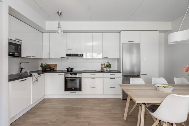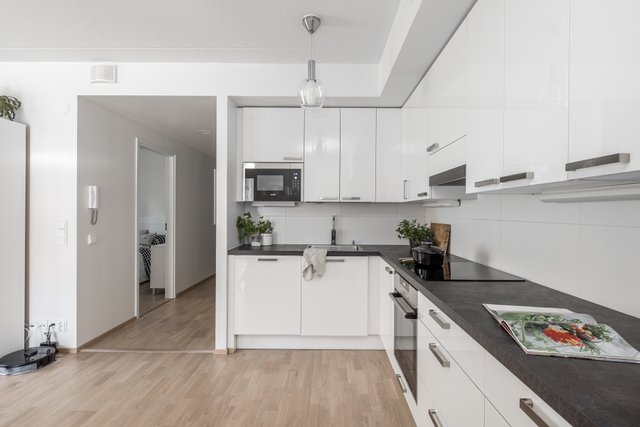 - Jääkaappi/pakastin, liesi, liesikupu, astianpesukone, mikroaaltouuni. Työtasot laminaattia. Seinät maalattu, parkettilattia.