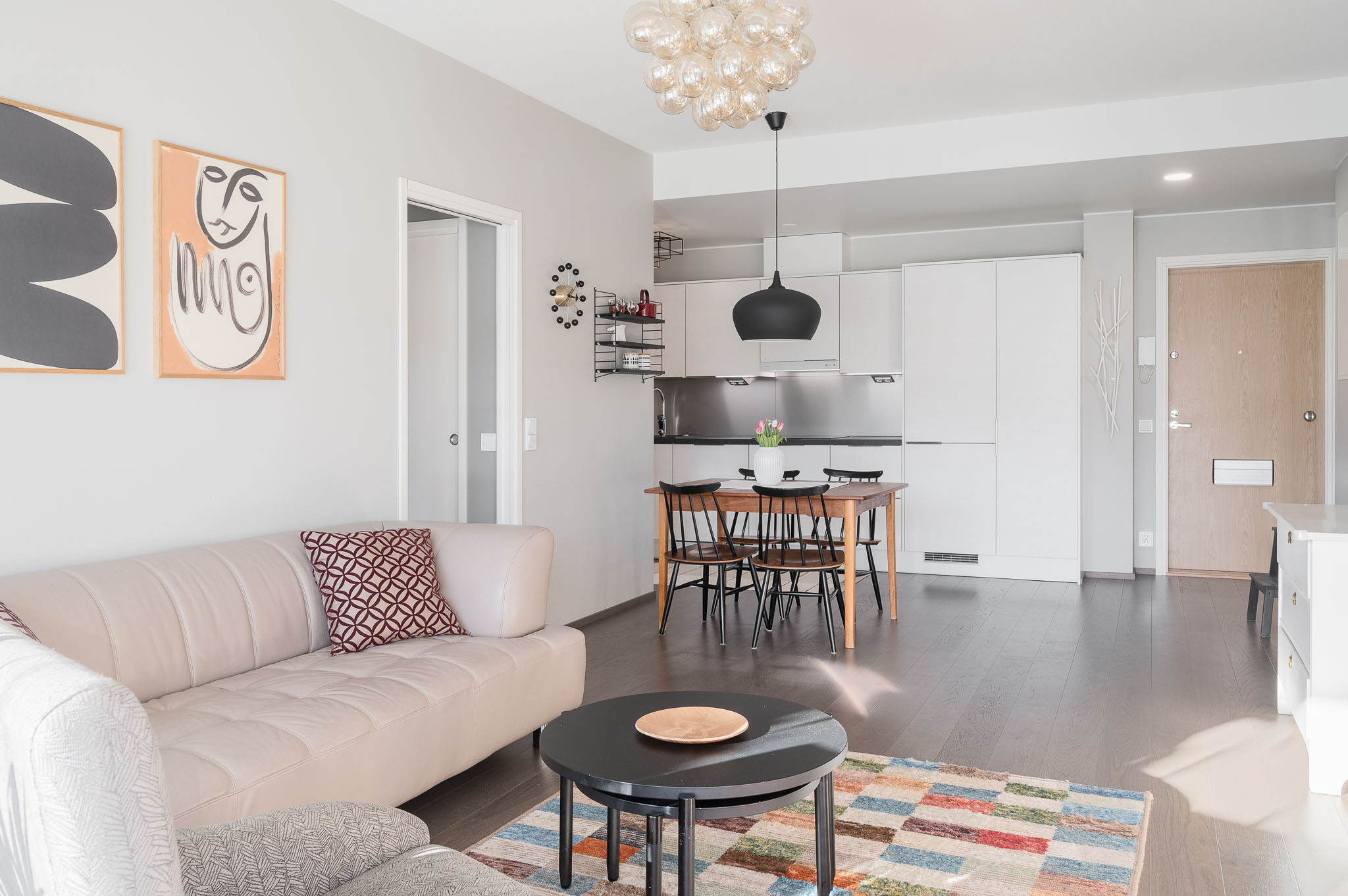 - Kompakti olohuone, josta kulku tilavalle lasitetulle parvekkeelle.