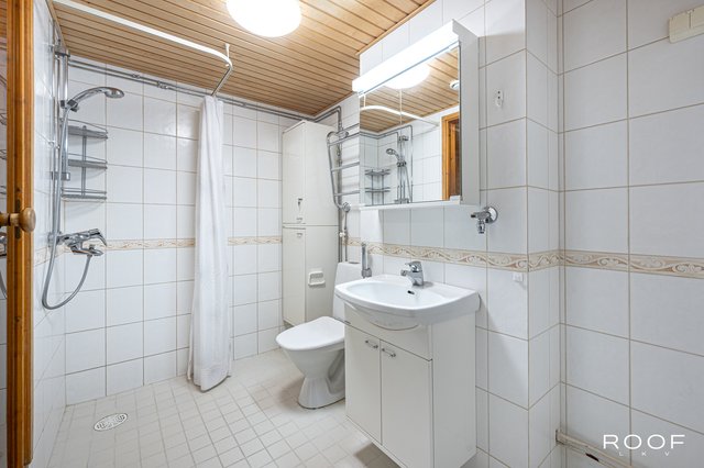 - WC-istuin, suihku, pesukoneliitäntä, peilikaappi, ja kylpyhuonekaapuisto