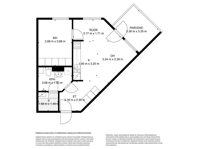 - Yhtiöjärjestyksen mukainen, Isännöitsijäntodistuksen mukainen, (Pinta-ala ei ole tarkistusmitattu ja todellinen pinta-ala voi olla suurempi tai pienempi, kuin ilmoitettu)