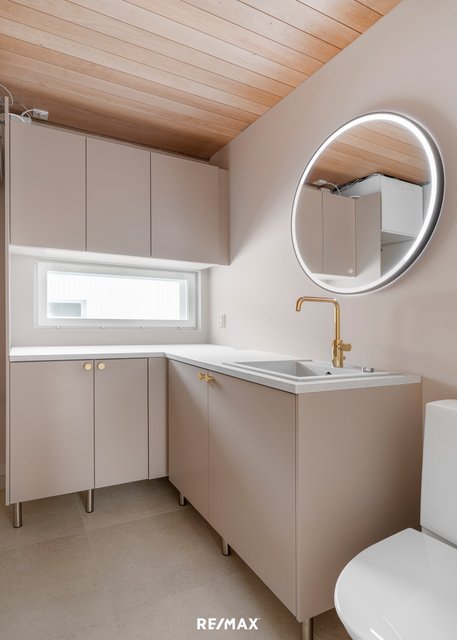 - Yläkerran kylpyhuoneen yhteydessä kodinhoitotila. Lattiassa laatta, seinissä maali (suihkualueella seinissä kaakeli). Varustus: pesuallas, pesukoneliitäntä, tila pesutornille, työtaso, suihku, suihkuseinä, wc-istuin, lattialämmitys.
