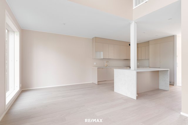 Olohuone, keittiö ja ruokailutila ovat kaikki yhtä avointa tilaa, mutta rytmitelty fiksusti erilleen. Keittiön suuri saareke on jokaisen kotikokkaajan unelma. Keittiön kaikki kodinkoneet ovat integroidut. Olohuoneesta on käynti terassille nauttimaan omasta pihasta. Olohuone avautuu osittain yläkertaan lisäten avaruutta ja luksuksen tunnetta huonekorkeus jopa 5,6 metriä.