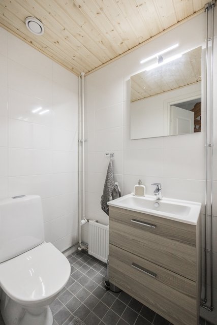 - WC-istuin, suihku, allaskaappi, bidee-suihku, pesuallas, peili, peilikaappi, lattialämmitys, pesukone, suihkuseinä, ja pesukoneliitäntä