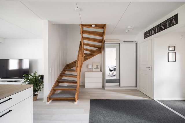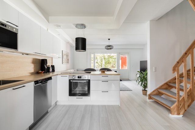 Vuonna 2022 huolella mietityt ja kauttaaltaan toteutetut remontit on kaunista katseltavaa. Keittiön seinien kaadon myötä on saatu tyylikäs avokeittiö kauniilla puun värisillä tasoilla. Tämä avokeittiö/olohuone/terassi-yhdistelmä toimii asunnon ehdottomana helmenä. Kaikki pinnat, yhtenevät modernin leveät laminaatit, kylpyhuone saunoineen, sekä erillinen wc on uusittu. Loistava kahden tason pohjaratkaisu, jossa makuuhuoneet (2kpl) yläkerrassa.