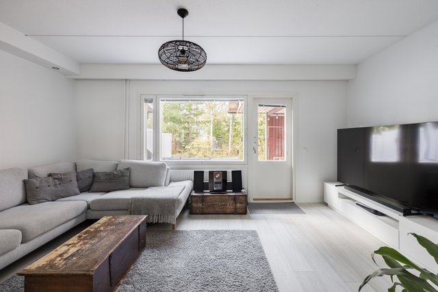 - Tilava remontoitu olohuone, josta kulku terassille ja omalle piha-alueelle metsäpalstaan rajoittuen.