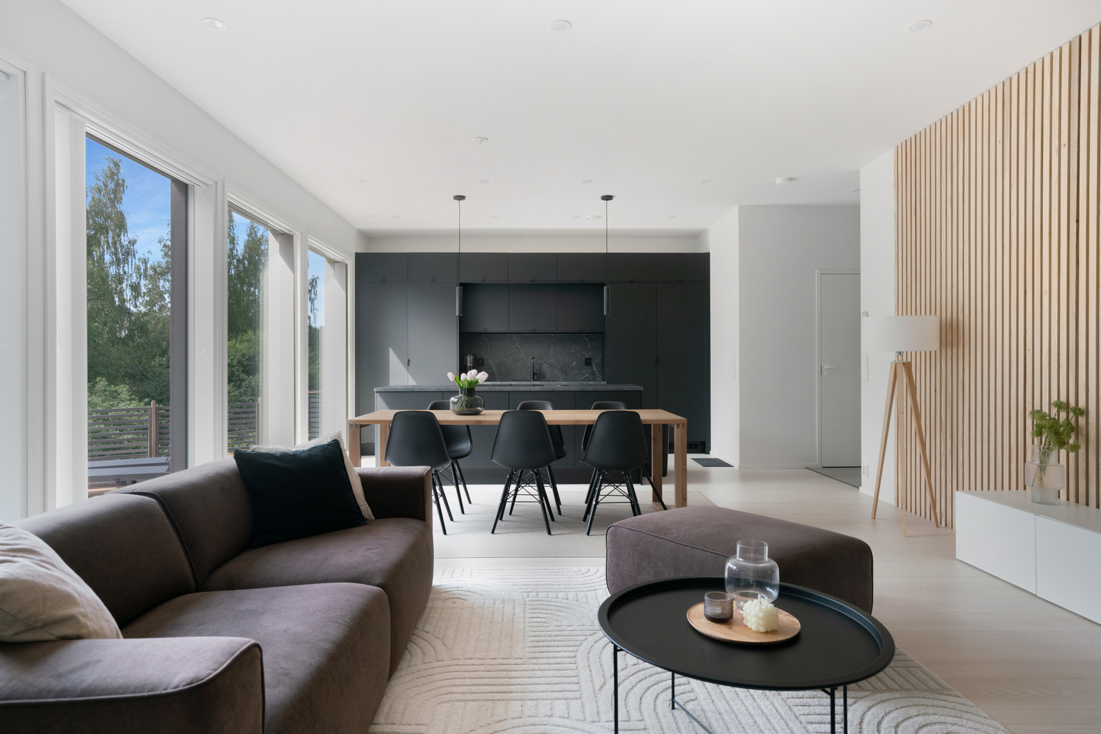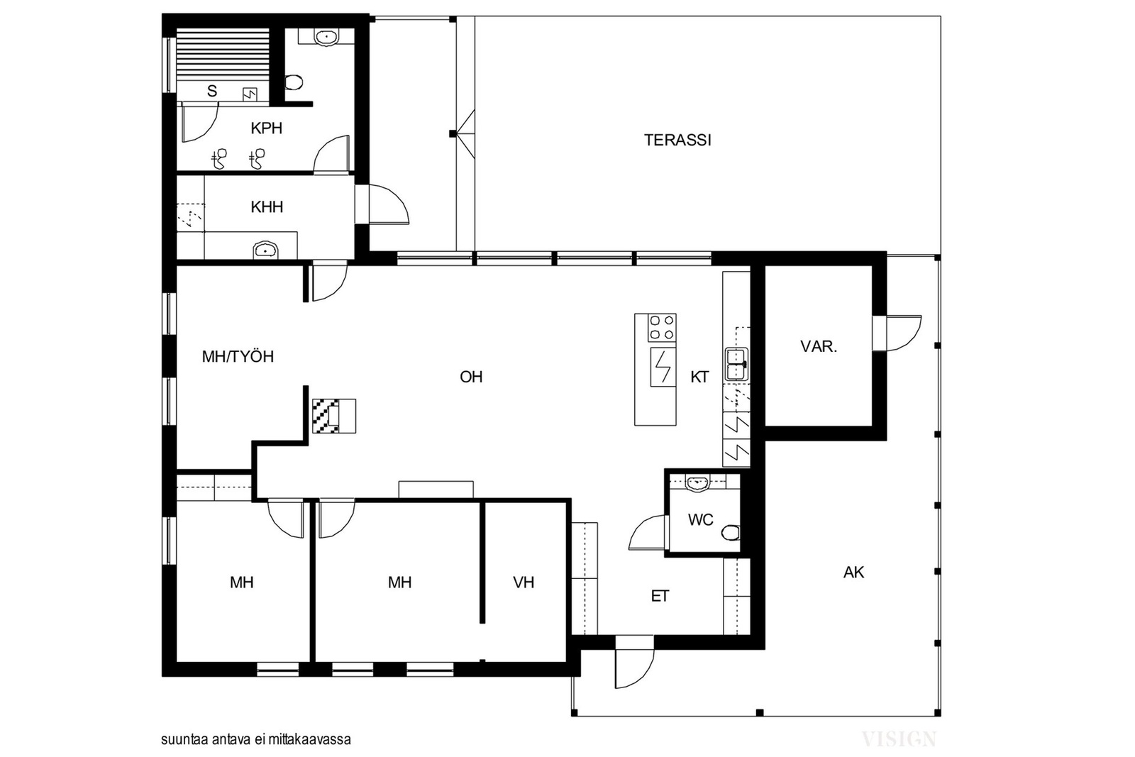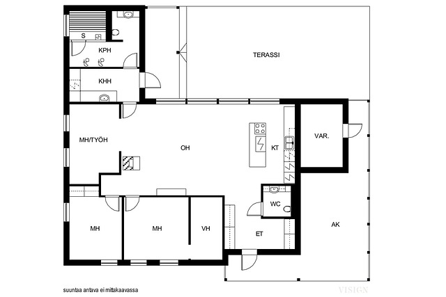 Tämän kokonaisuuden parhaita puolia edullisen lämmitysjärjestelmän sekä loistavan sijainnin lisäksi on hyvä pohjaratkaisu. Talo on rakennettu laadukkaasti ja se näkyy mm. materiaali- ja tilaratkaisuissa, kuten Keittiömaailman (Isku) kaapistoissa ja korkeammassa huonekorkeudessa (2,8m). Keittiö on tämän kodin sydän ja se yhdistyy saumattomasti ruokailutilaan ja olohuoneeseen mahdollistaen yhden suuren ja valoisan tilan. Keittiön suuri saareke takaa reilusti tasotilaa sekä helpon seurustelun olohuoneessa olevien vieraiden kanssa. Saareke toimii kokkauspisteenä ja lieden yhteydessä on integroitu liesituuletin. Lähes koko tupakeittiön ulkoseinä on ikkunapinta-alaa, josta kaunis ja vehreä puistomaisema. Täältä myös helppo seurata esim. lemmikkien tai lasten touhuja takapihalla tai terassilla. Kolme makuuhuonetta, joista yhden yhteydessä tilava ja upea vaatehuone. Yksi makuuhuoneista tällä hetkellä työhuonekäytössä, tässä lasiset liukuovet, joiden ansiosta huone tuntuu olohuoneen jatkolta. Tämä huone mahdollista muuttaa helposti perinteisemmäksi makuuhuoneeksi niin halutessaan.