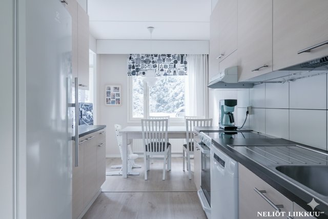- Jääkaappipakastin, liesi, liesituuletin, astianpesukone, ja uuni