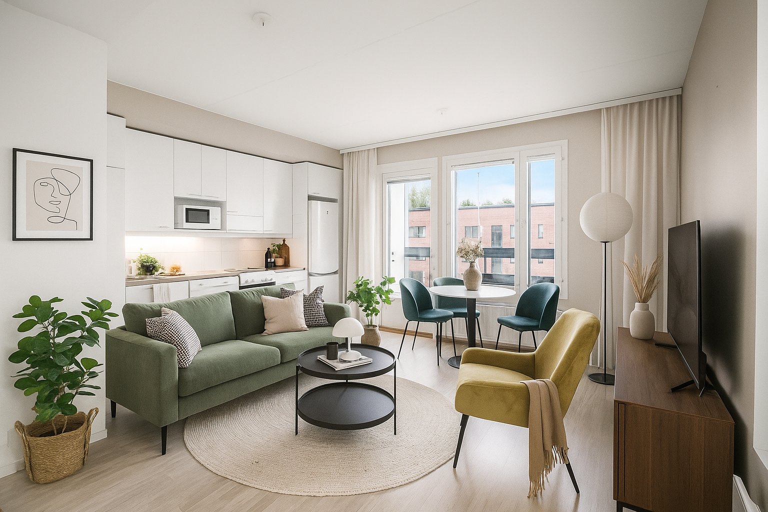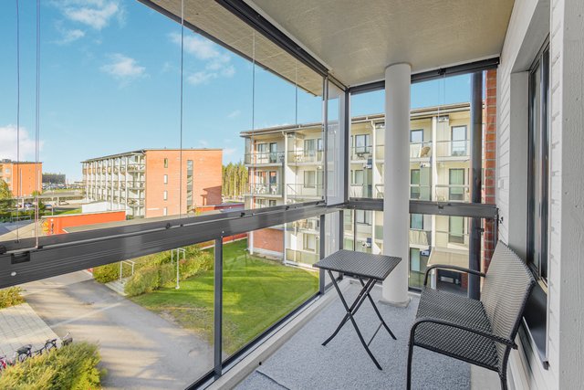 Valoisa ja toimiva yksiö talon ylimmässä kerroksessa. Pohjaratkaisussa on käytännöllinen tupakeittiö, erillinen alkovi sekä siisti pesuhuone. Asunnon helmi on huoneiston levyinen lasitettu länsiparveke, jolta avautuvat avarat näkymät ja jossa voit nauttia ilta-auringosta pitkälle syksyyn.