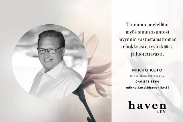 - Pesukoneliitäntä, lattiakaivo, silityspöytä/taso, pyykkikaapit, ja keskuspölynimuri