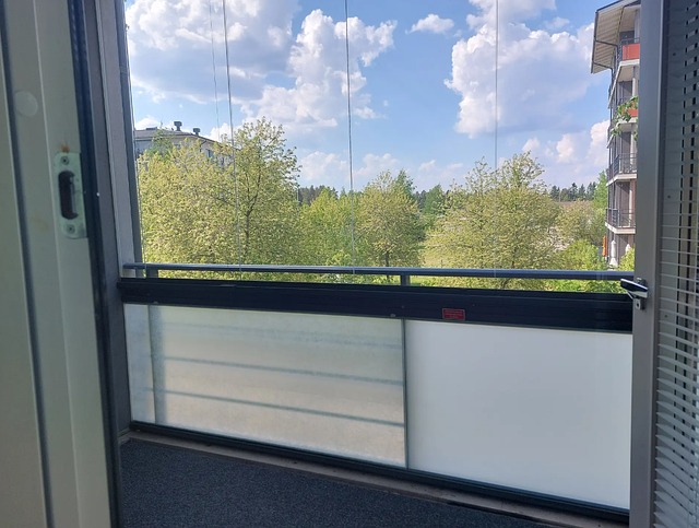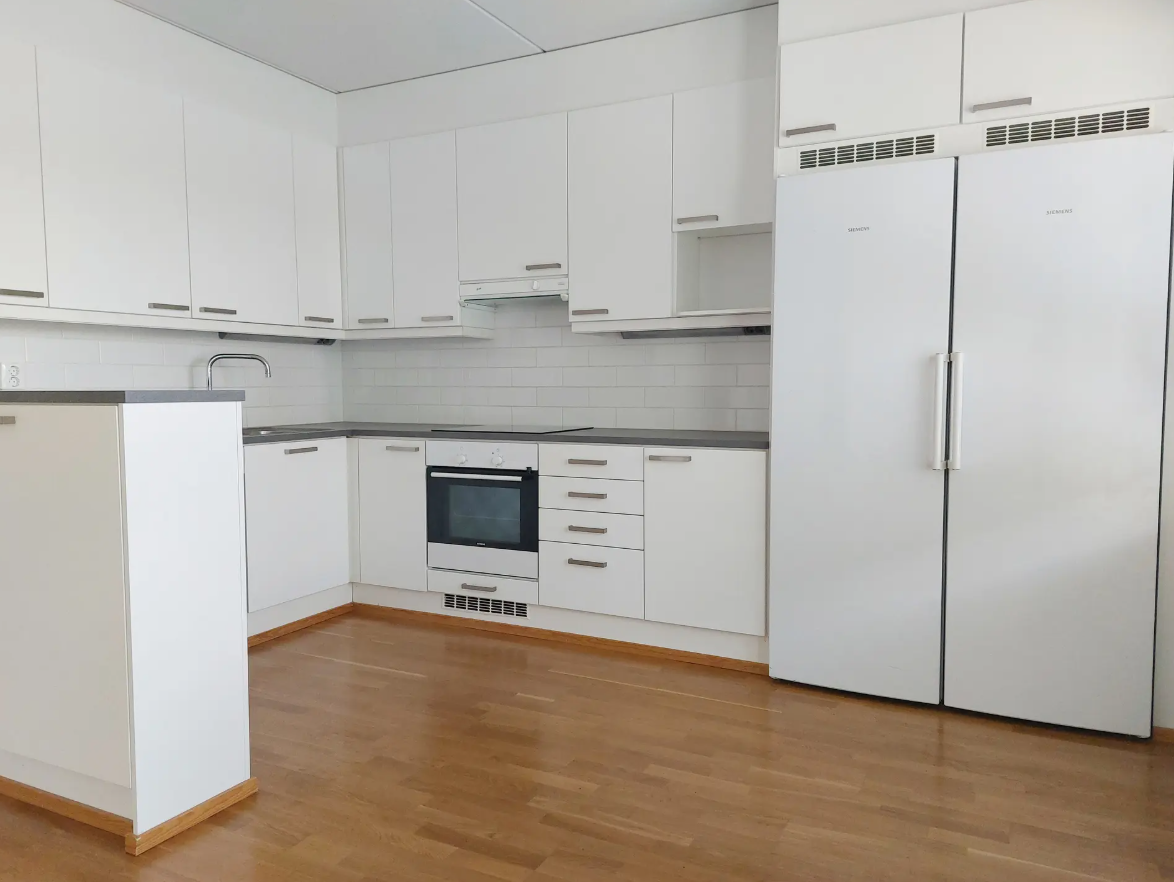 Asunnon sauna ja lasitettu parveke lisäävät asumismukavuutta, sekä keittiön saareke jakaa kivasti keittiön omaksi osakseen olohuoneesta.