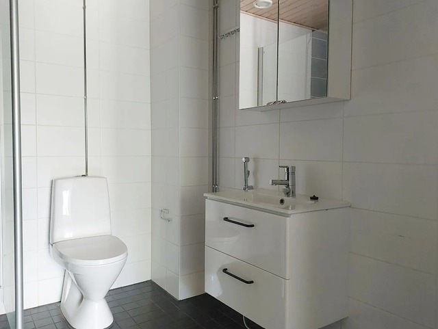 - Peilikaappi, suihkuseinä, allaskaappi, suihku, pesukoneliitäntä, lattialämmitys, ja wc-istuin