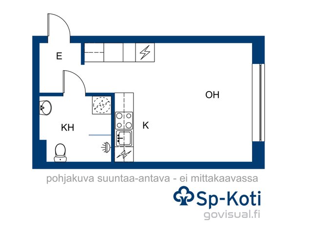 Tämän viidennen kerroksen asunnon 30,5 neliömetriä on suunniteltu tehokkaasti. Keittiöstä löytyy kaikki tarpeellinen – kaapistot, jääkaappipakastin, astianpesukone ja keraaminen liesi. Kylpyhuone on kokonaan laatoitettu, ja siellä on lattialämmitys, suihku sekä pesukoneliitäntä.