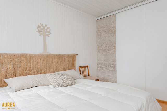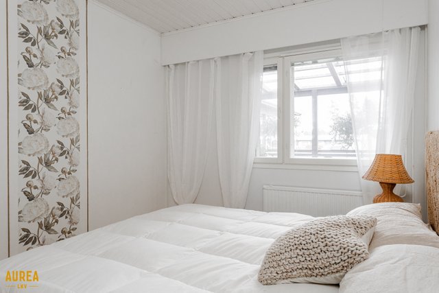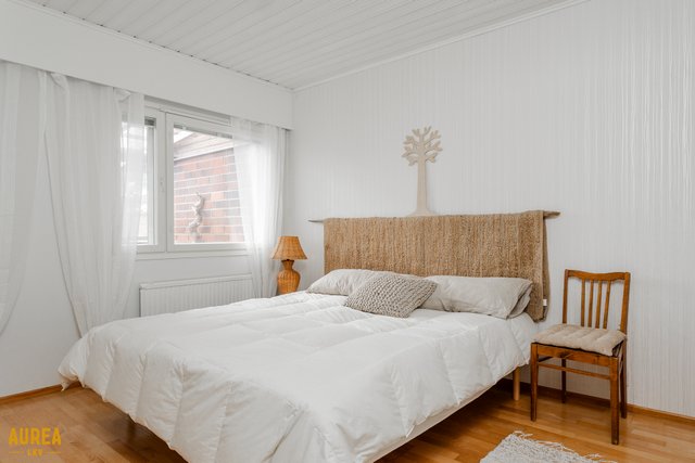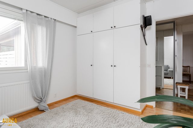 Kaksi makuuhuonetta tarjoavat hyvät säilytystilat, ja toisessa on vaatehuone. Kylpyhuone on remontoitu samana vuonna kuin keittiö, ja sieltä löytyy paikka pyykinpesutornille. Asunnossa on myös erillinen wc ja oma sauna, jossa on siistit, vaaleat lauteet ja sähkökiuas.