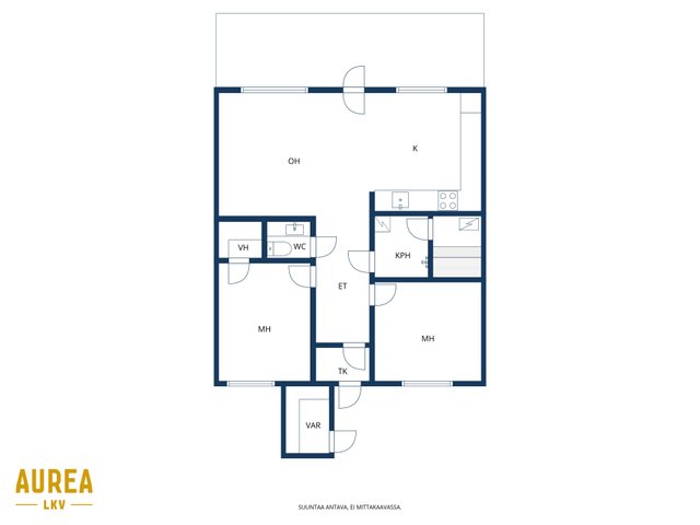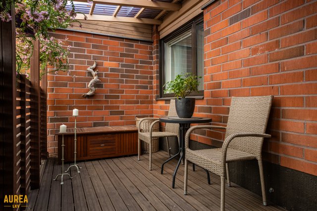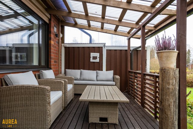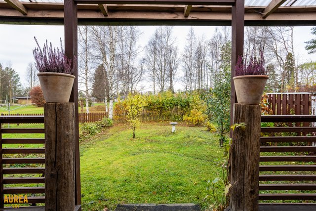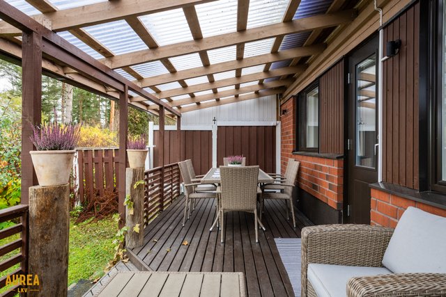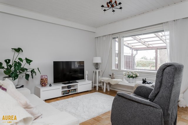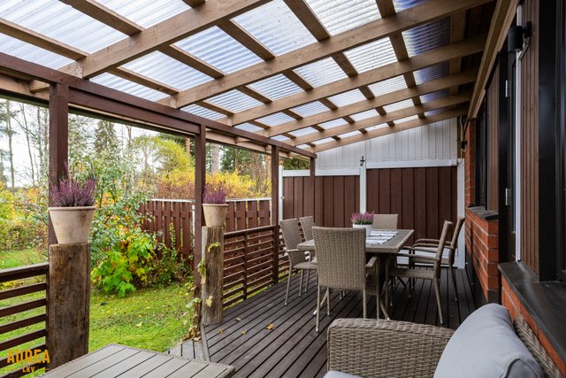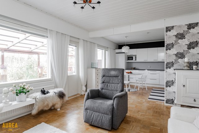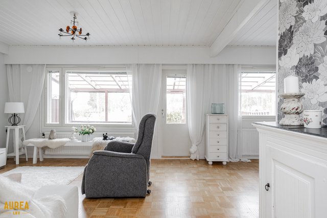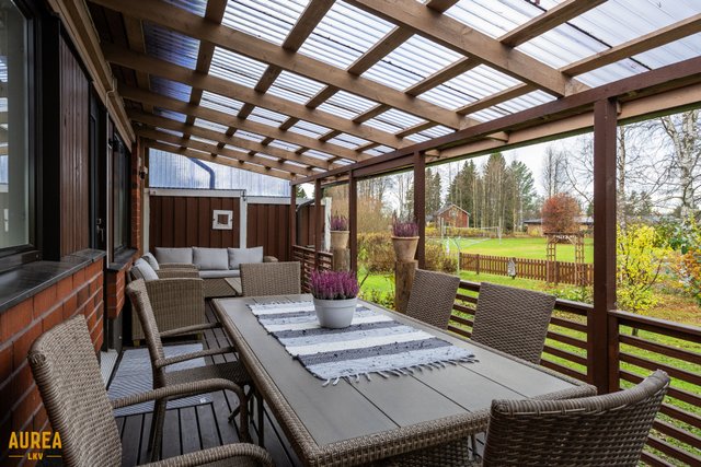 - Olohuone on tilava josta isot ikkunat avautuvat omalle suojaiselle pihalle. Tilasta on kulku katetulle terassilla.