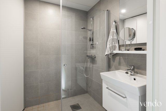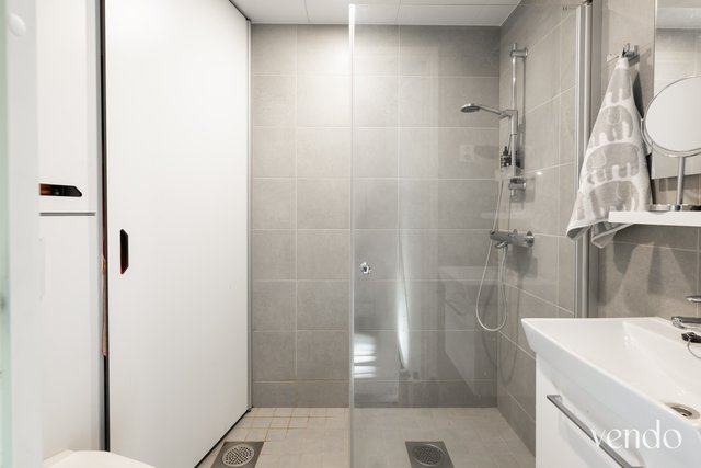 - Suihku, suihkuseinä, wc-istuin, bidee-suihku, peilikaappi, pesuallas, allaskaappi, pesukoneliitäntä, ja lattialämmitys