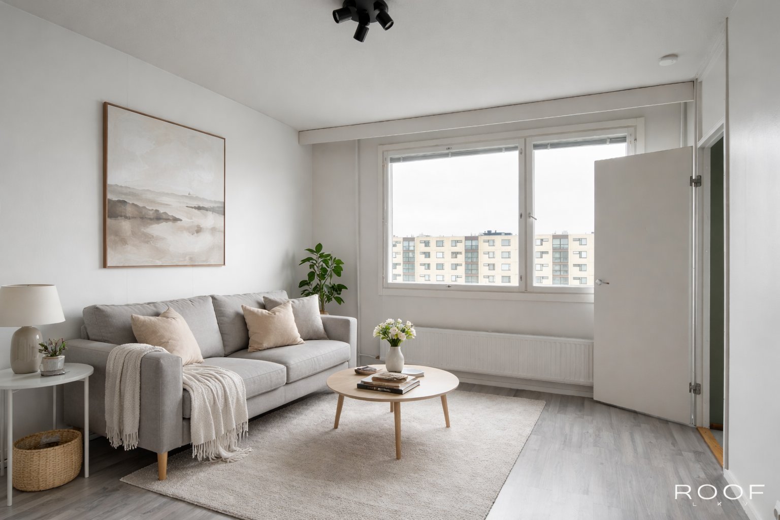 Kuudennessa kerroksessa sijaitsevasta asunnosta avautuvat avarat näkymät kaupungin ylle. Kompakti ja toimiva keittiö palvelee arjen tarpeita sellaisenaan ja tarjoaa haluttaessa mahdollisuuden päivittää ilmettä omien toiveiden mukaisesti.
