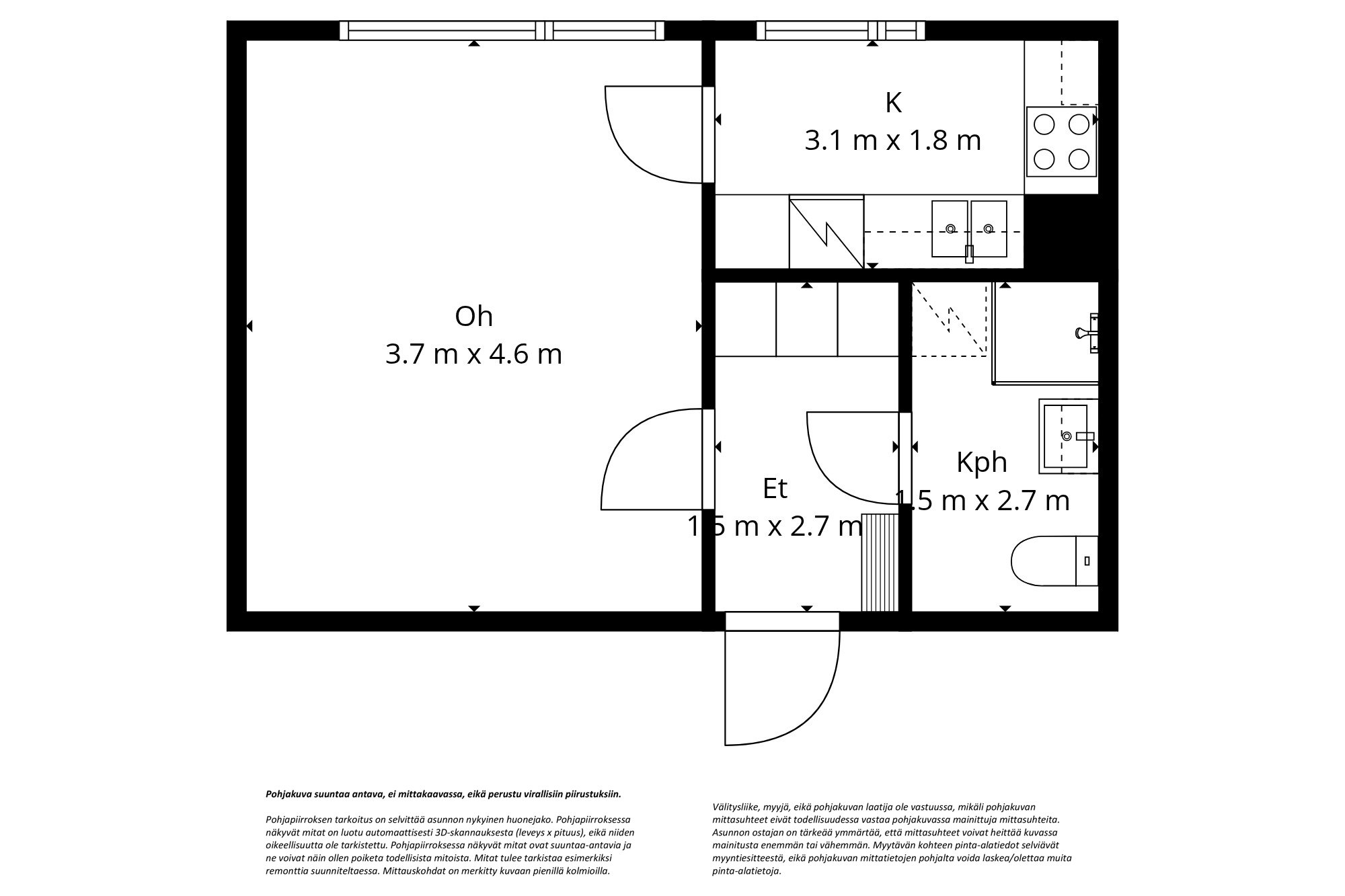 - Ei tarkistusmitattu. Pinta-alat saattavat tämän ikäisissä kohteissa (yhtiö rekisteröity ennen 01.01.1992) poiketa olennaisestikin asuinrakennusten nykyisten mittaustapojen ja standardien (SFS 5139) mukaan laskettavasta asuintilojen pinta-alasta. Pinta-ala voi siis olla edellä mainittua pienempi tai suurempi.