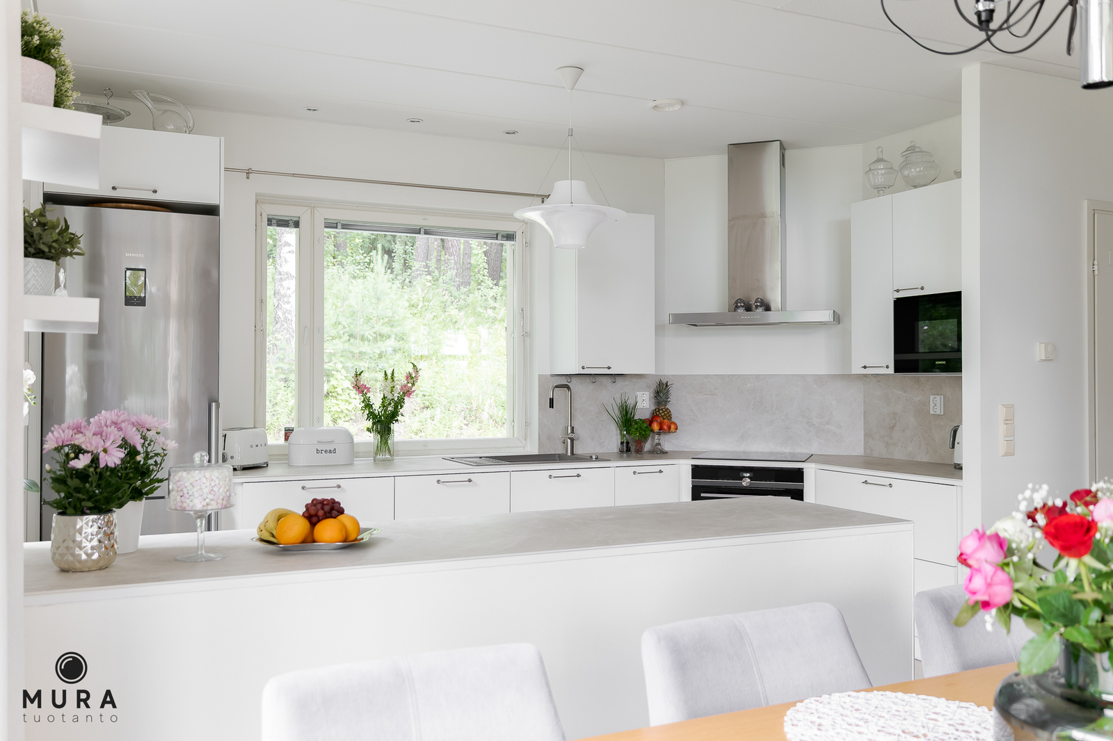 - kiinteät kaapistot, sälekaihtimet, alakerran makuuhuoneiden pimennysverhot (rullaverhot), kiinteät valaisimet, mahdollisuus siirtää hälytysjärjestelmä, terassilämmitin, jätesäiliöt.