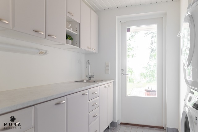 - Varustelu: kiinteät kaapistot, allas, pesukoneliitäntä, paikka pesutornille, silityspöytä/taso, pyykkikaapit, pöytätaso, kiinteät valaisimet, lattialämmitys ja kulku ulos. Laattalattia, seinät maalattu.