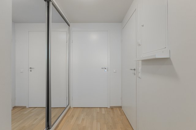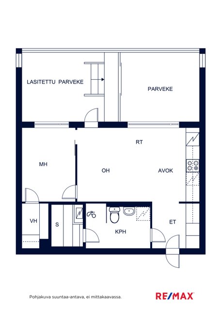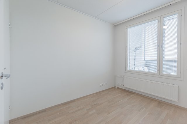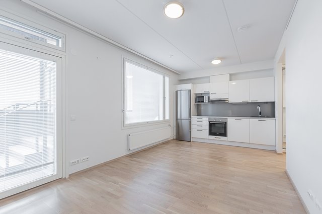 Avokeittiö, olohuone ja ruokailutila muodostavat yhtenäisen, avaran ja valoisan kokonaisuuden. Makuuhuoneessa on liukuovi ja oma vaatehuone, joka tuo runsaasti säilytystilaa ja viimeistelee toimivan pohjaratkaisun.