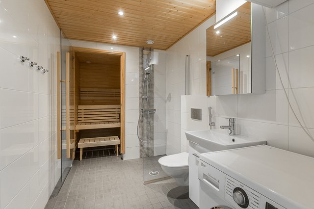 - Lattialämmitys, suihku, suihkuseinä, peilikaappi, seinä-wc, allaskaappi, bidee, pesukoneliitäntä, ilmanvaihtokone.