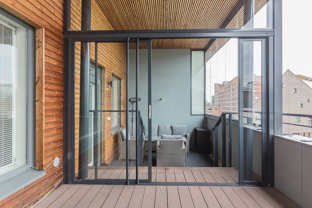 Olohuoneesta avautuu upea, tilava ja kaksiosainen parveke, joka on kivasti kahdessa tasossa. Toinen osa on lasitettu, ja tilan jakavat -tyylikkäät lasiovet. Parvekkeelta aukeavat upeat lännen suuntaiset näkymät Tikkurilantorille ja tämän kaltaisia parvekkeita löytyy vain ylimmän kerroksen asunnoista.