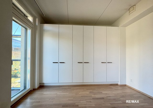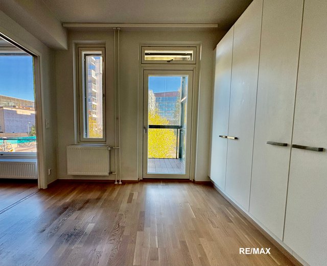 - Liukuovi makuuhuoneeseen. Seinän levyinen kaapisto. Käynti parvekkeelle.