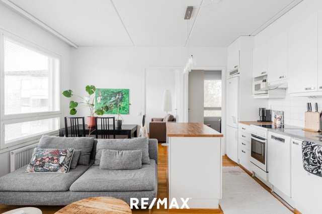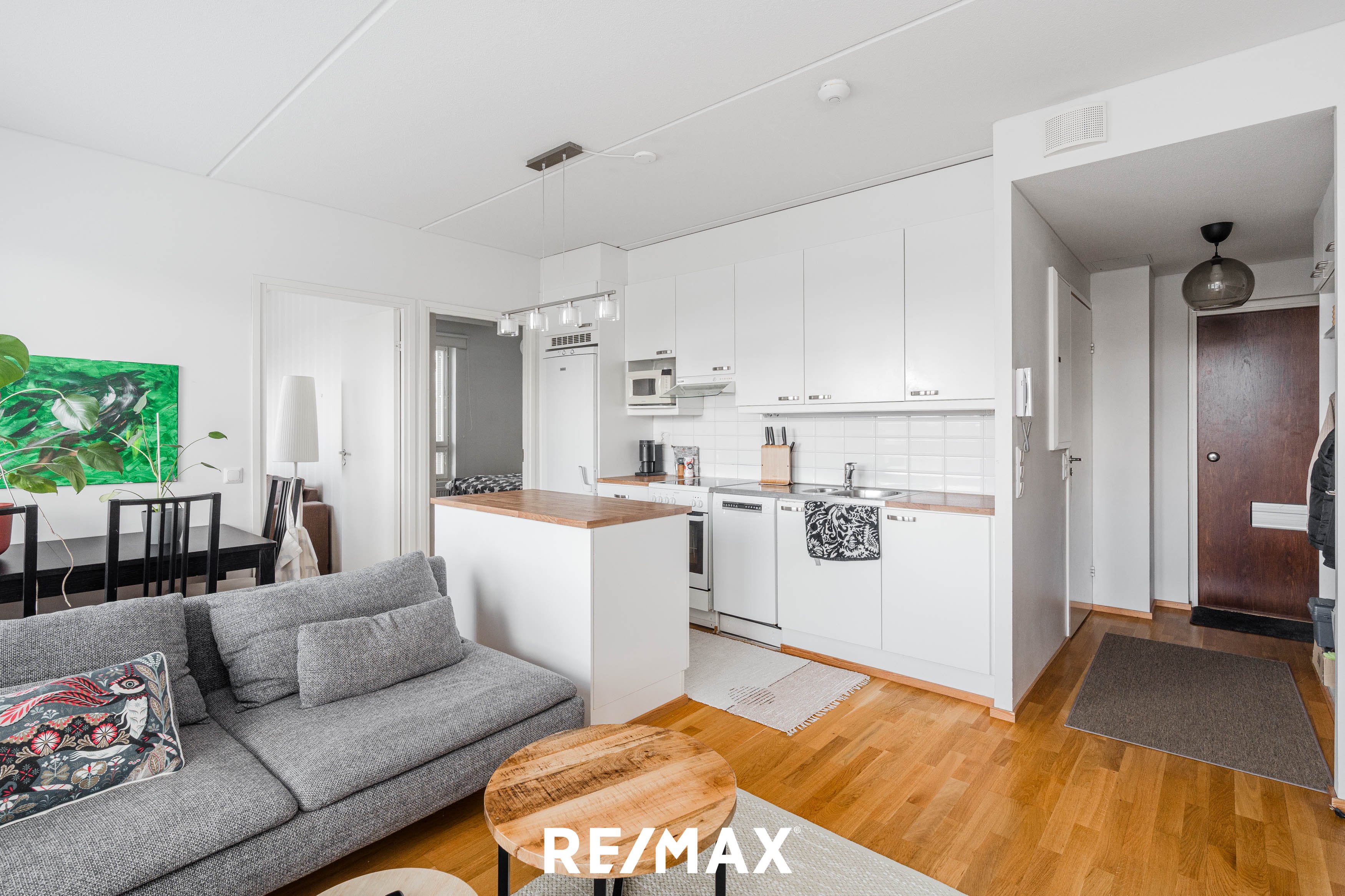 Olohuoneen ja keittiön yhtenäinen tila luo avaruutta ja mahdollistaa mukavat hetket perheen tai ystävien seurassa.