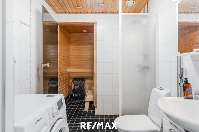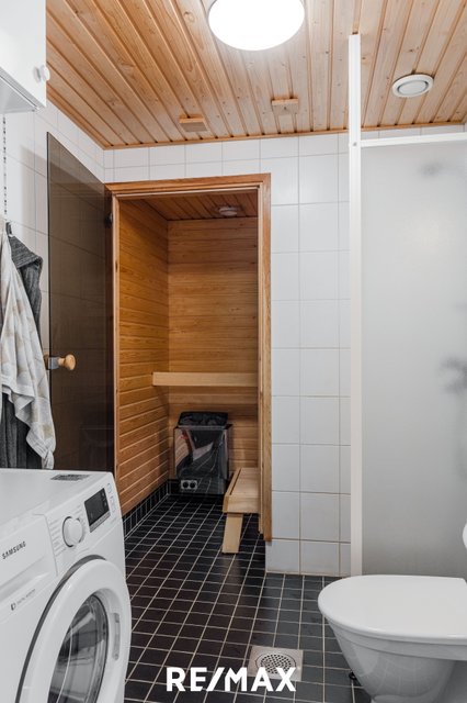 - WC-istuin, suihku, suihkuseinä, pesukoneliitäntä, lattialämmitys, peilikaappi, pesuallas, allaskaappi, ja bidee-suihku