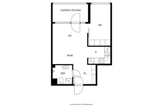 - Kohteen markkinoinnissa käytetään mittatiedoilla varustettua pohjapiirrosta. Pohjapiirroksen tarkoitus on helpottaa ostajan ostopäätöstä ja selvittää asunnon nykyinen huonejako. Lukija on tietoinen, että pohjakuva on suuntaa antava, ei mittakaavassa, eikä perustu virallisiin piirustuksiin. Välitysliike, myyjä, eikä pohjakuvan laatija ole vastuussa, mikäli pohjakuvan mittasuhteet eivät todellisuudessa vastaa pohjakuvassa mainittuja mittasuhteita. Lukijan on tärkeää ymmärtää, että mittasuhteet voivat heittää kuvassa mainitusta enemmän tai vähemmän. Myytävän kohteen pinta-alatiedot selviävät myyntiesitteestä, eikä pohjakuvan mittatietojen pohjalta voida laskea/olettaa muita pinta-alatietoja.