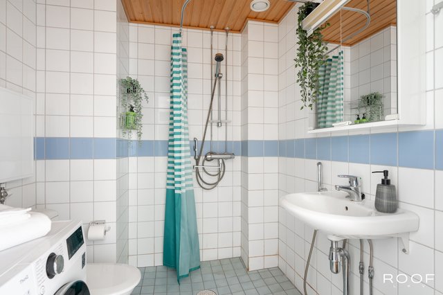 - WC-istuin, suihku, pesukoneliitäntä, ja peilikaappi