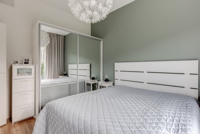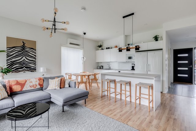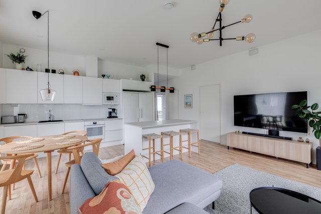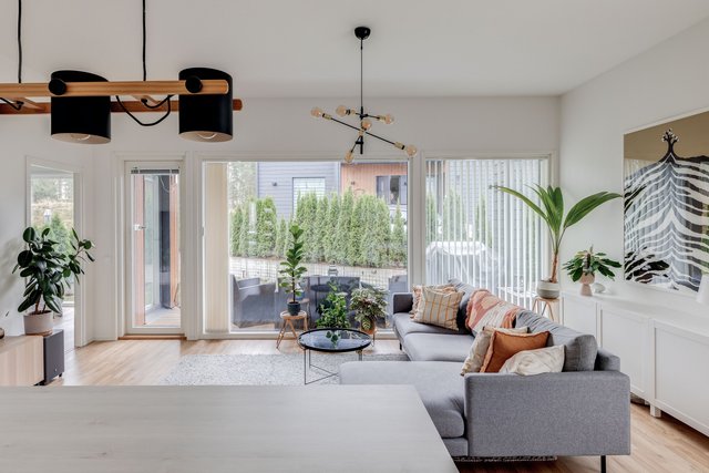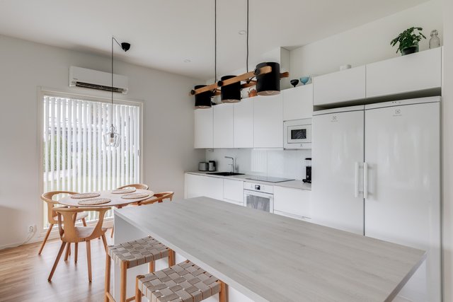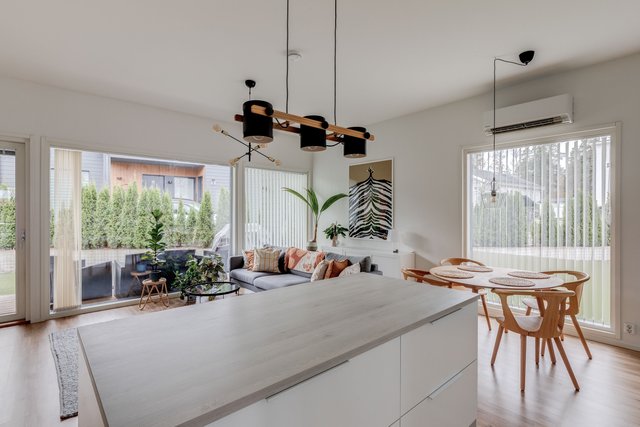 Kodin sisätilat ovat avarat ja valoisat, ja korkea huonekorkeus luo tilantuntua. Olohuoneen suuret ikkunat tuovat runsaasti luonnonvaloa sisään, ja laadukas parkettilattia viimeistelee tyylikkään ilmeen. Keittiö on varustettu nykyaikaisilla kodinkoneilla ja siellä on runsaasti tilaa kokkailuun.