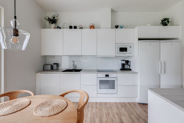 - Jääkaappi, erillinen pakastin, liesi, uuni, liesituuletin, mikroaaltouuni, ja astianpesukone