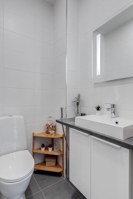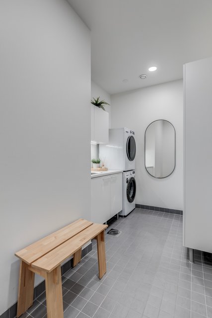 - Lattialämmitys, pesukoneliitäntä, pesuallas, pyykkikaapit, pöytätaso, tila pesutornille, ja lattiakaivo