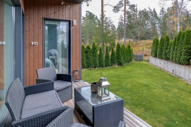 Ulkoalueella on viihtyisä terassi, jossa voi nauttia aurinkoisista päivistä. Talon yhteydessä on myös kylmä ulkovarasto, joka tarjoaa lisäsäilytystilaa.