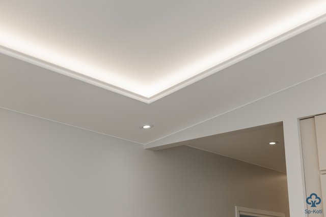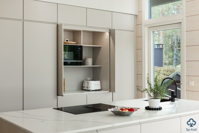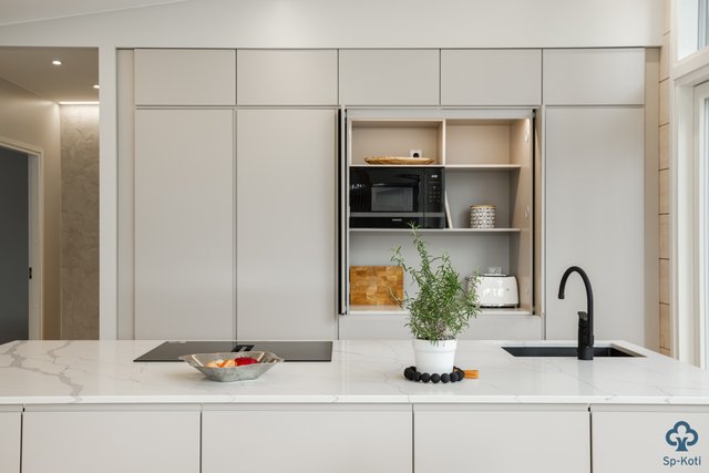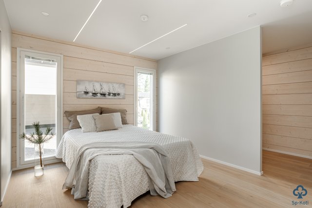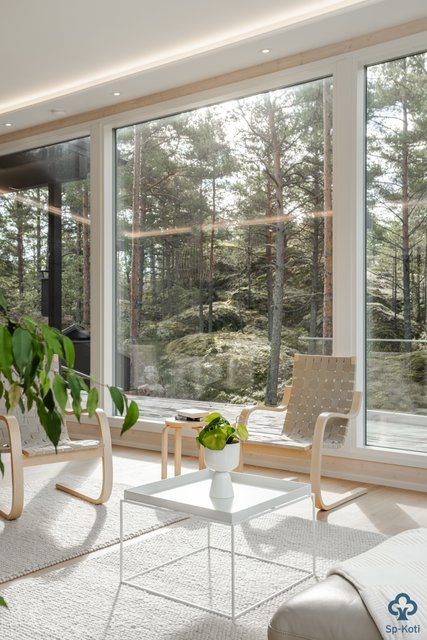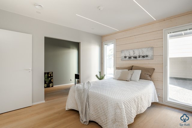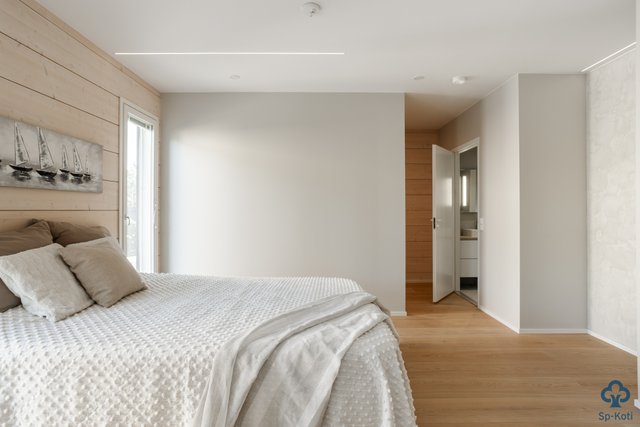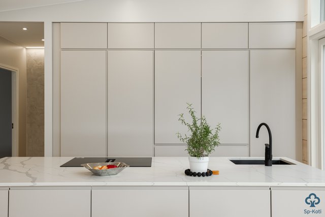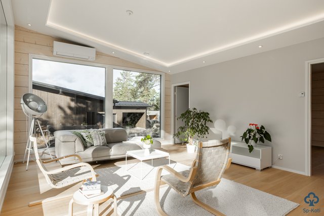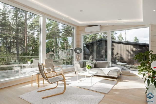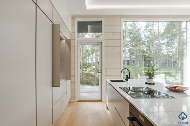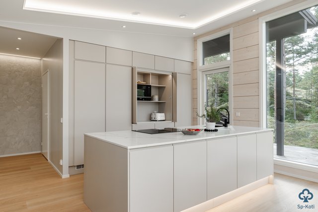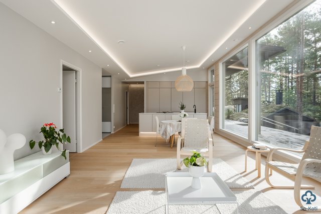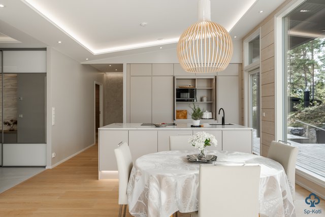 Kaikki asuintilat ovat käytännöllisesti yhdessä kerroksessa, mikä on suunniteltu perheen tarpeet huomioiden. Näyttävässä olohuoneen ja avokeittiön muodostamassa kokonaisuudessa huomio kiinnittyy valtaviin ikkunoihin, joista avautuu kaunis, metsäinen maisema, joka elää vuodenaikojen vaihtuessa. Suurista ikkunoista tulvii luonnonvaloa ja huonekorkeus nousee parhaimmillaan yli kolmeen metriin, mikä korostaa avaruutta sekä tilan tuntua. Hieno keittiö on varusteltu erittäin laadukkaasti Siemensin integroiduilla kodinkoneilla sekä kestävällä kvartsitasolla. Tällä hetkellä makuuhuoneita on kolme, mutta isoimman makuuhuoneen yhteydessä olevasta työhuoneesta voi tarvittaessa erottaa vielä neljännen makuuhuoneen.