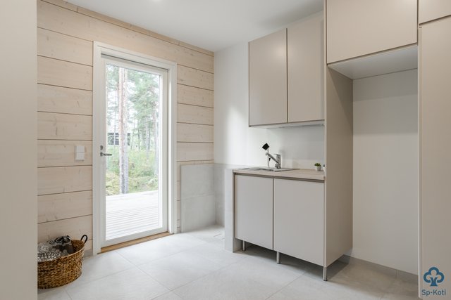 - Paikka pesutornille, pesuallas, kurapiste, kaapistot ja lattialämmitys. Lattia laattaa ja seinät maalattu.