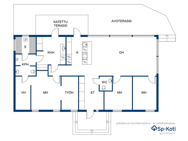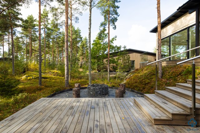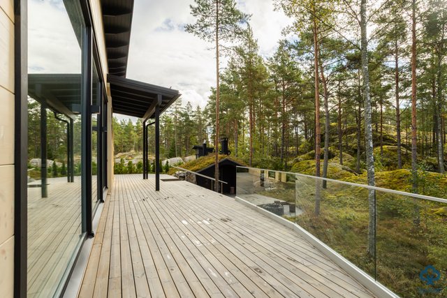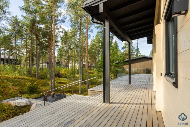 - Takapihalla iso, osittain katettu terassi, jossa tyylikäs SteelPro tolpaton lasikaidejärjestelmä. Takaterassilla on varaus porealtaalle. Lisäksi etupihalla kuisti.