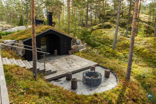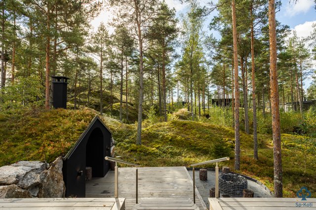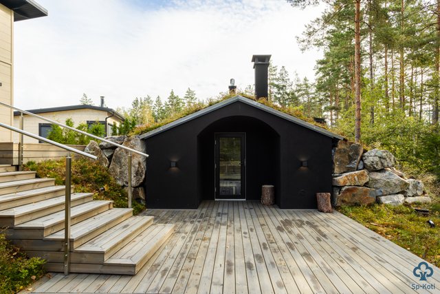 - Takapihalla upea ja tunnelmallinen holvisauna (kokonaisala noin 7 m²). Etupihalla kahden auton autokatos, jonka yhteydessä lämmin varasto (kokonaisala noin 16 m²). Autokatoksessa varaus sähköauton latausasemaa varten.