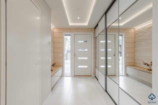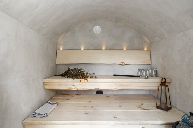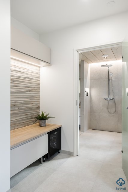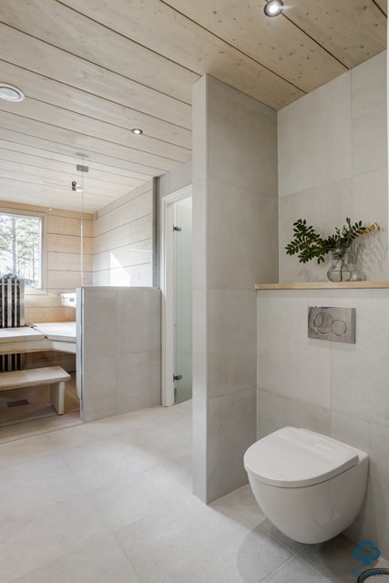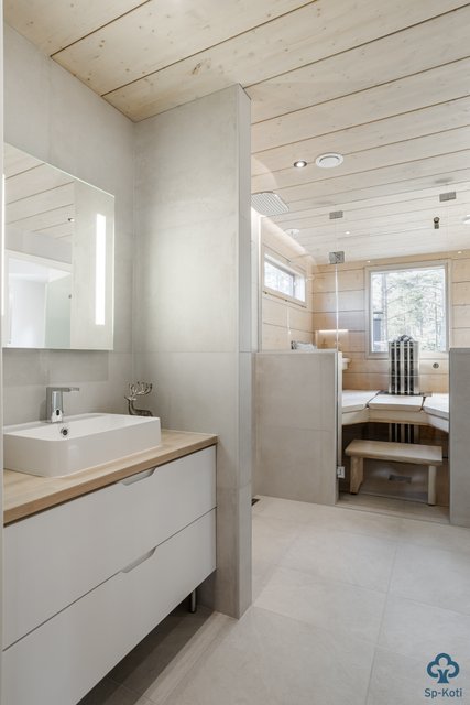 Tilava kodinhoitohuone ja erittäin tyylikäs kylpyhuone tekevät perheen arjesta sujuvaa. Saunassa on upeat käsin veistetyt lankkulauteet ja löylyjen lomassa ikkunasta voi ihailla rauhoittavaa metsämaisemaa. Poikkeuksellisen rentoutumismahdollisuuden luo myös takapihalle rakennettu todella tunnelmallinen holvisauna, joka tarjoaa tavallista kosteammat ja pehmeämmät löylyt rakenteensa ja puukiukaansa ansiosta. Lisäksi takapihan suuri, osittain katettu terassi on täydellinen paikka nauttia aurinkoisista päivistä, sillä ilmansuunnat osuvat täydellisesti talon asemoinnin kanssa. Terassilla on myös varaus porealtaalle.