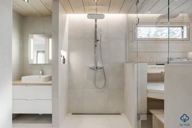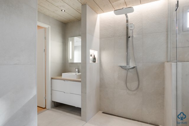 - Oras Esteta hierova suihku, Unidrain linjalattiakaivo, seinä-wc, pesuallas, peili, allaskaappi ja lattialämmitys. Lattia ja seinät laattaa.