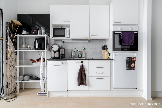 - Varustus: jääkaappi/pakastin, astianpesukone, keraaminen liesitaso ja erillisuuni, liesituuletin.