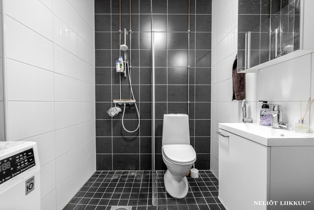 - Varustus: suihku, suihkuseinä, allas ja allaskaappi, peili, wc-istuin, bidee-suihku, pesukoneliitäntä.