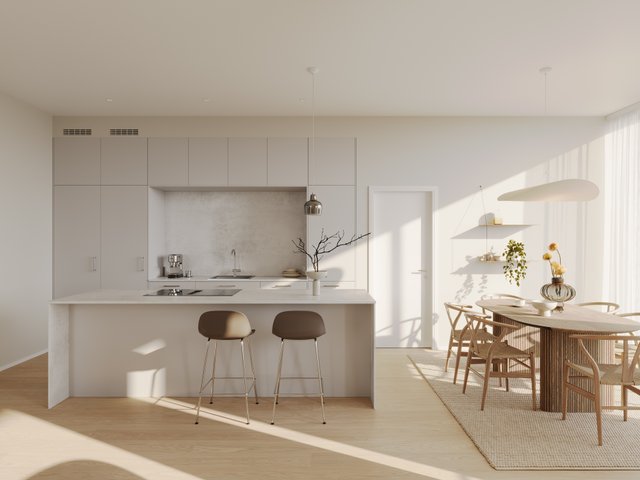 - Moderni, raikas ja toimiva keittiö saarekkeeseen upotetulla induktiotasolla liesituulettimella, erillisuuni, mikroaaltouuni sekä integroidut kylmälaitteet. Runsaasti säilytystilaa.