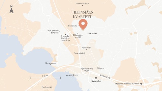 - Palvelut Päiväkoti Touhula 270 m Tillinmäen päiväkoti 450 m Saunalahden koulu 1 km S-Market Saunalahti 700 m K-Supermarket Lasihytti 2,9 km Kirjasto 1 km Apteekki 2,5 km Terveysasema 3,6 km Kuntosali 1,2 km Kivenlahden uimaranta 2,4 km Sarfvik Golf 6,4 km Hybridiarena Hype 1,9 km Kauppakeskus Lippulaiva 3,2 km Kauppakeskus Liila 6 km Kauppakeskus Merituuli 8,2 km Iso Omena 8,5 km Bussipysäkki 50 m Metro Kivenlahti 2,4 km Helsingin keskusta 20 km