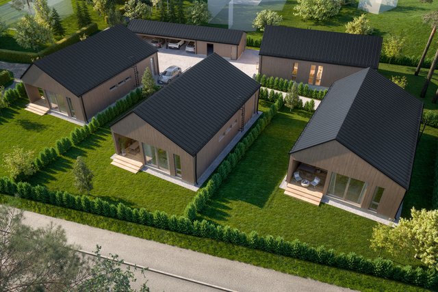 Jokaiseen taloon kuuluu autokatospaikka sekä pihapaikka.