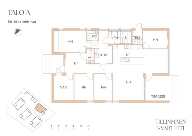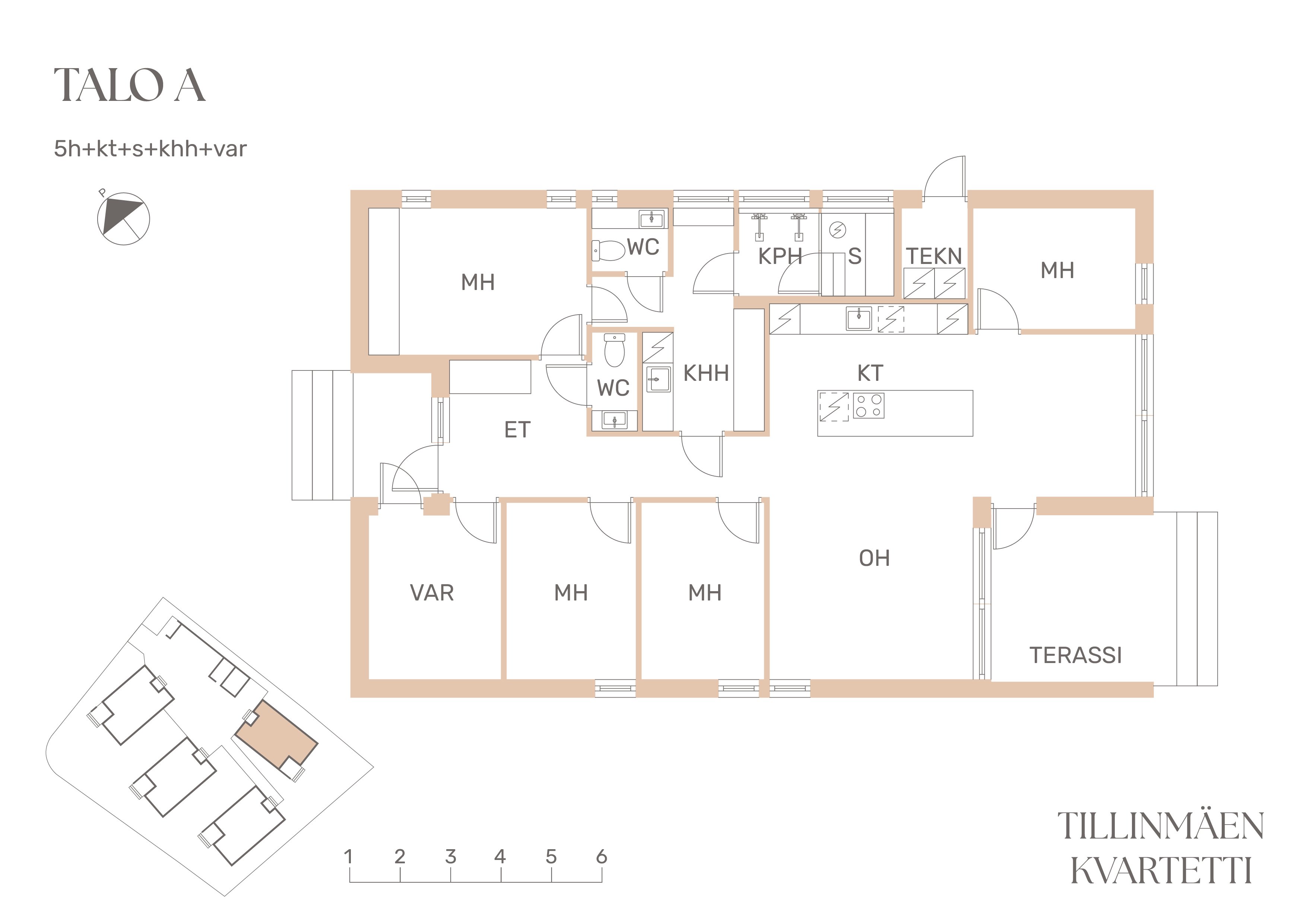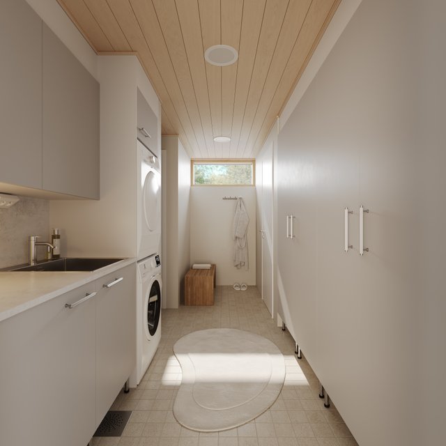 Talojen pohjaratkaisut ovat identtiset ja tarjoavat 120 neliömetriä hyvin suunniteltua asuintilaa. Käytännölliset kodinhoitotilat, lasiseinäinen sauna pesuhuoneen yhteydessä sekä neljä makuuhuonetta tekevät kodeista toimivia arjessa. Sisäänkäynnin yhteydessä oleva monikäyttöinen huone sopii erinomaisesti esimerkiksi työtilaksi tai varastoksi.
