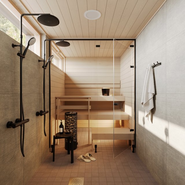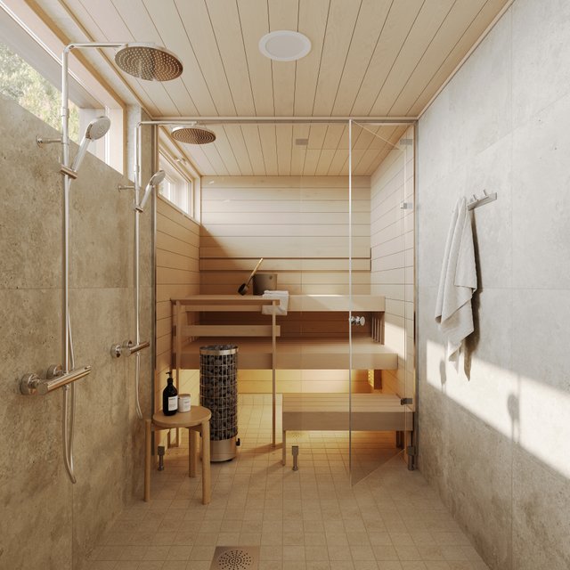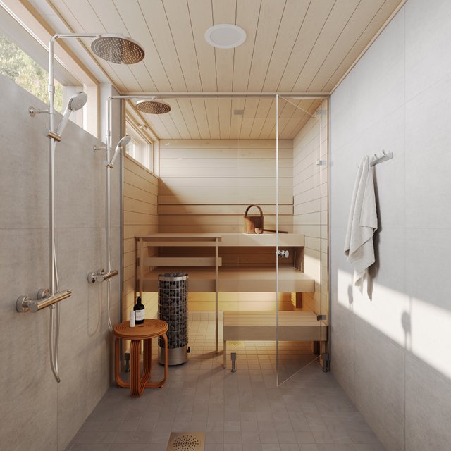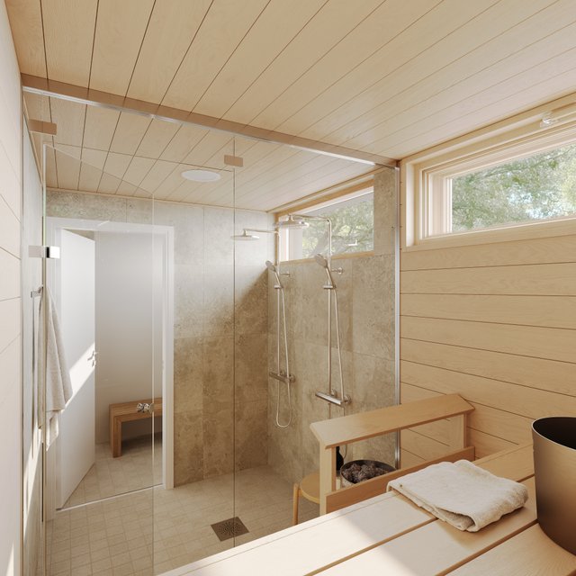 - Valoisa kylpyhuone lasiseinäisellä saunalla, pilarikiukaalla ja kahdella sadesuihkulla. Asunnossa on lisäksi kaksi erillistä wc:tä ja kodinhoitohuone.